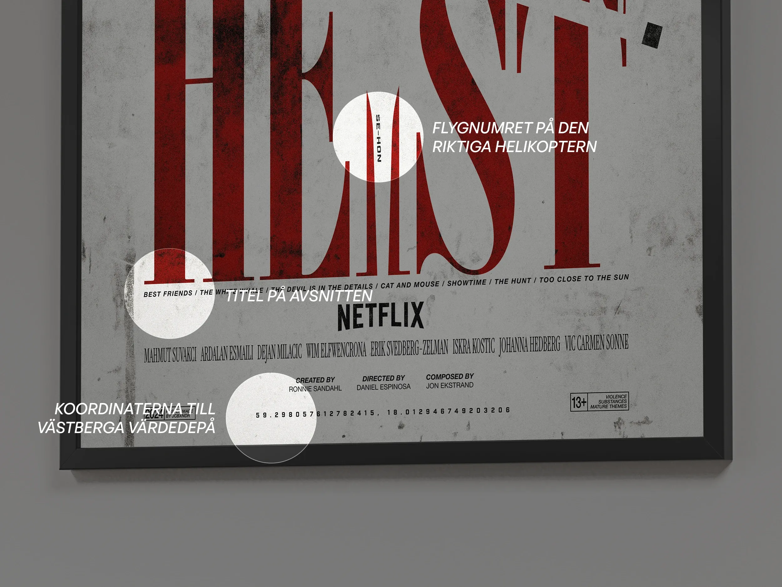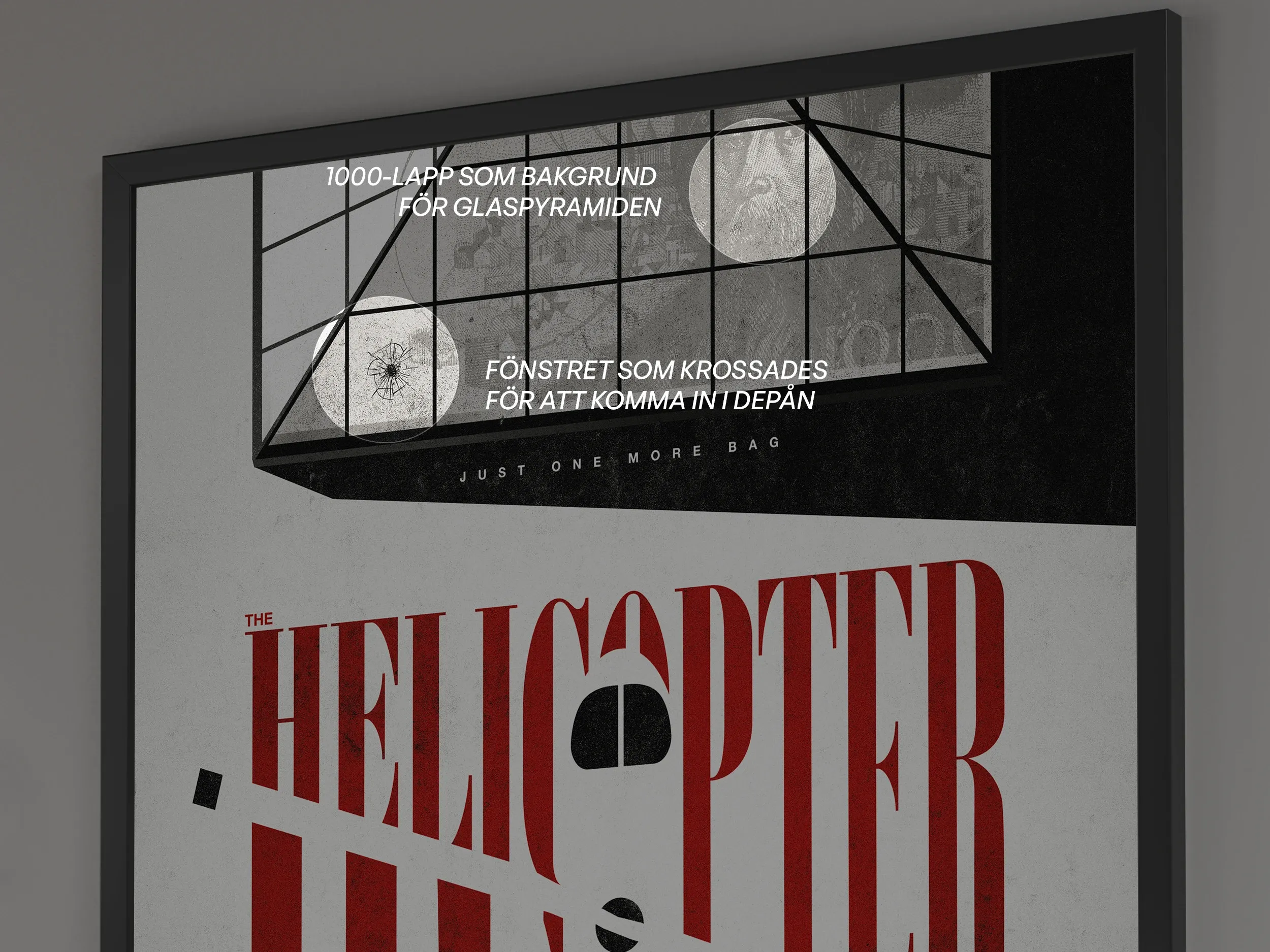 Inofficiellt uppdrag. När Netflix-serien Helikopterrånet släpptes i slutet av 2024 blev den snabbt en av plattformens mest sedda titlar. Serien, som dramatiserar det spektakulära rånet från 2009, fångade en stor publik – inklusive mig. Inspirerad av originalomslaget ville jag skapa min egen version, samtidigt som jag behöll vissa visuella element, såsom glaspyramiden och helikopterns silhuett.